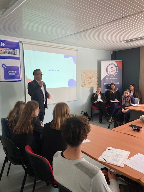 Accueillis en salle de réunion par le directeur de l’établissement et son adjoint, les élèves ont assisté à une présentation détaillée du rôle de directeur d’hypermarché.