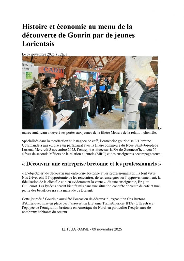 Le 5 novembre 2025, les élèves de Seconde MRC, accompagnés de leurs professeurs, ont visité une entreprise gourinoise partenaire : L’Hermine Gourmande, spécialisée dans la torréfaction de café.