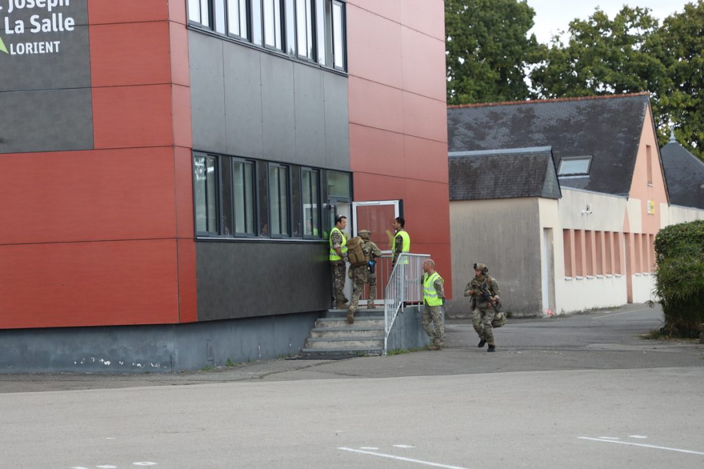 Cet exercice, composé de 3 phases a permis de faire évoluer l’unité d’élite au sein du bâtiment Djibouti du collège pour libérer les élèves otages puis d’effectuer un « faux » déminage sur un plastron emprisonné d’explosifs sur la cour du collège et enfin d’investir le bâtiment France en neutralisant, à l’aide d’un chien, un des preneurs d’otages.