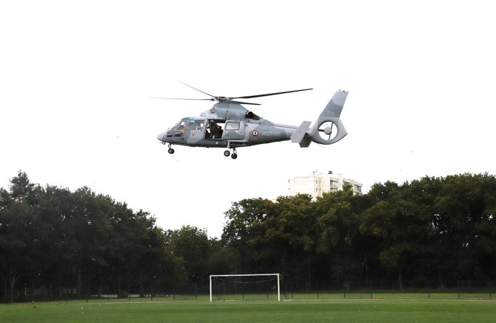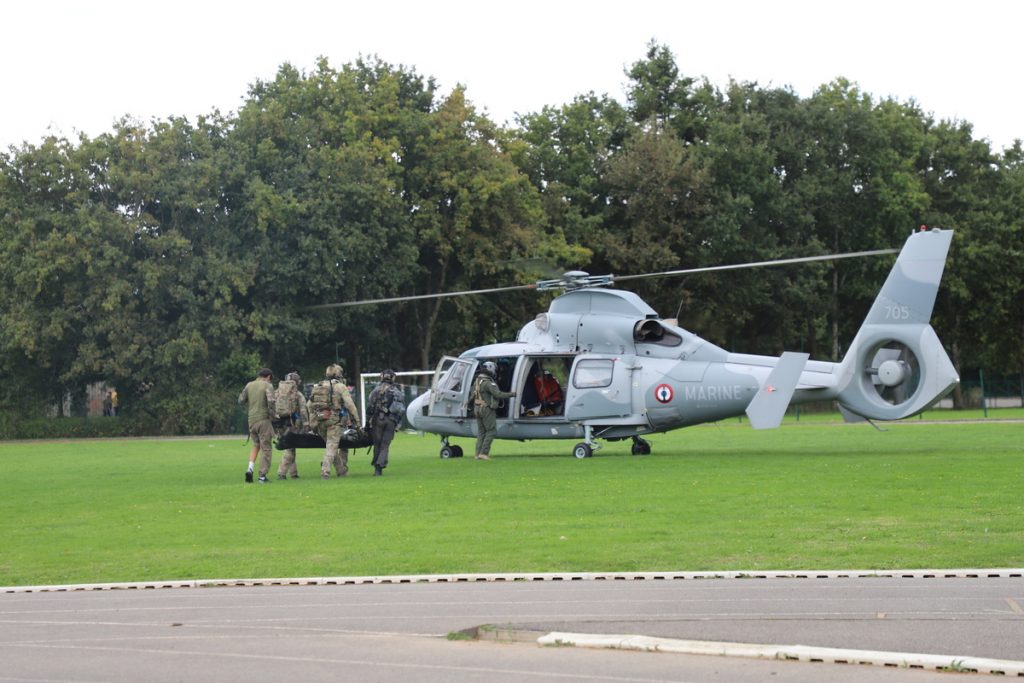 Cette démonstration a été riche en évènements puisqu’un hélicoptère a survolé la zone pour appuyer l’action des forces spéciales et participé à l’évacuation des élèves jouant le rôle des blessés.